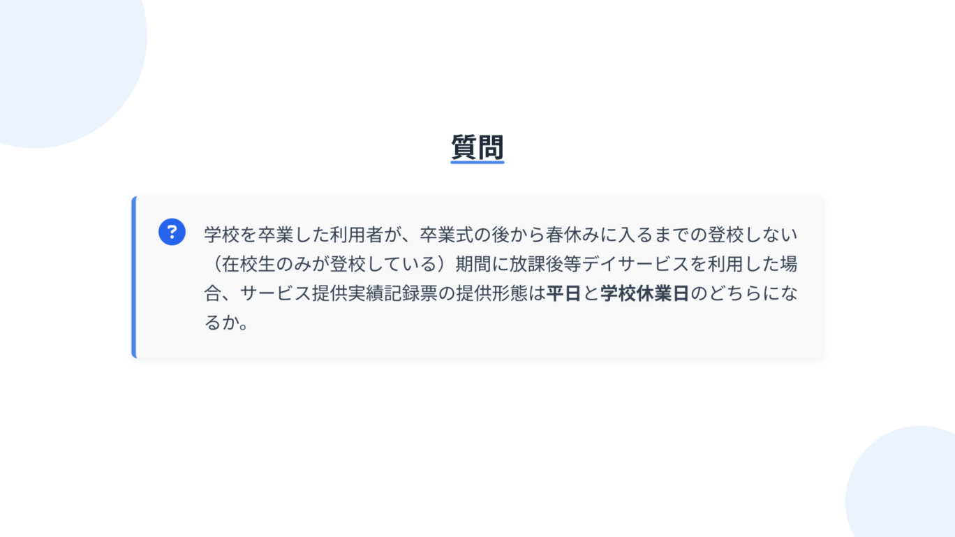 この「卒業式のあとから春休みまでの平日」に放課後等デイサービスを利用した場合、その日のサービス提供形態は「授業の終了後」と「学校休業日」どちらに該当するのでしょうか。