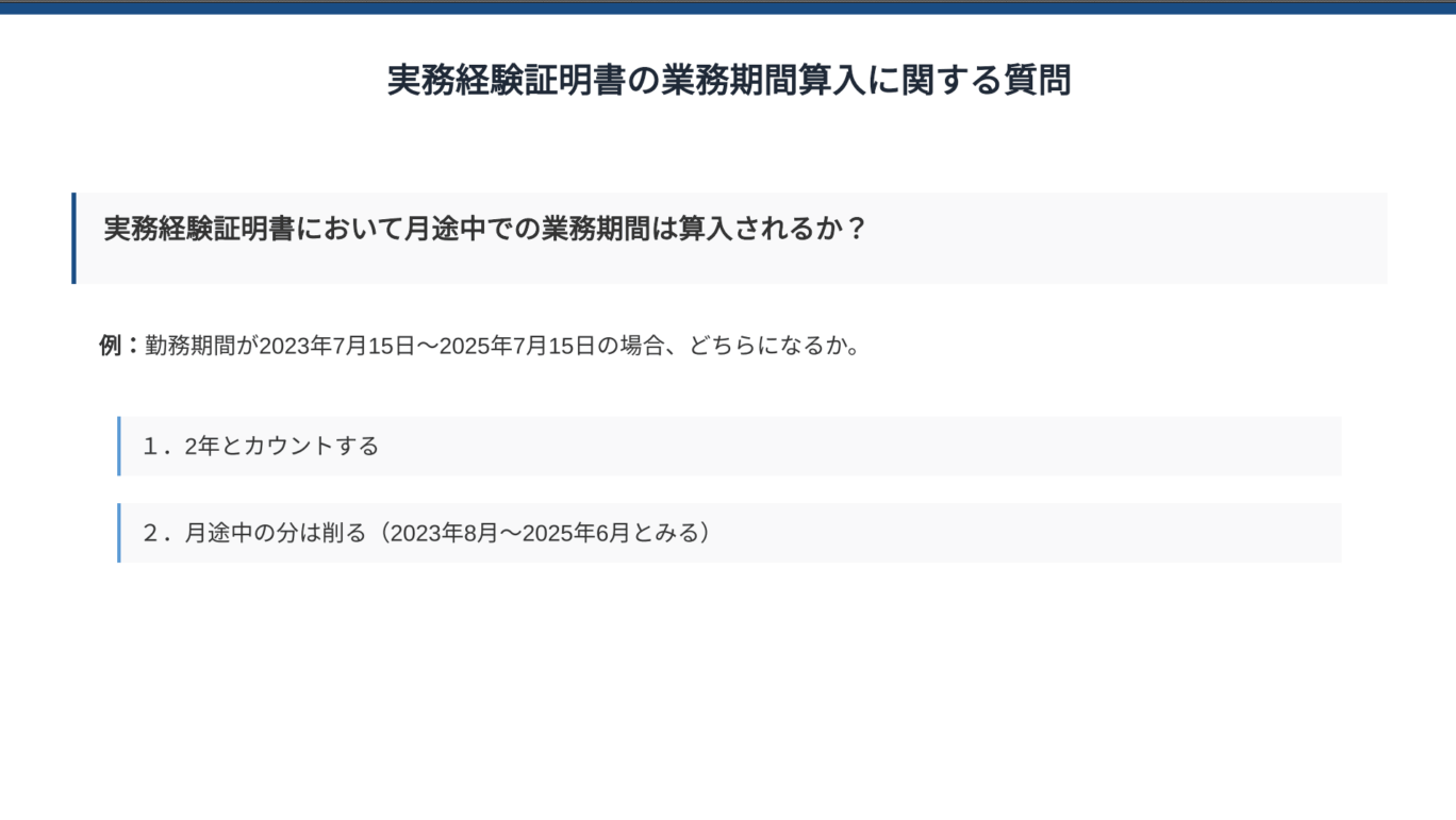 今回は、実務経験証明書に関するよくあるご質問から、「業務期間が月途中から始まった場合、その期間は実務経験としてカウントされるのか?」について解説します。