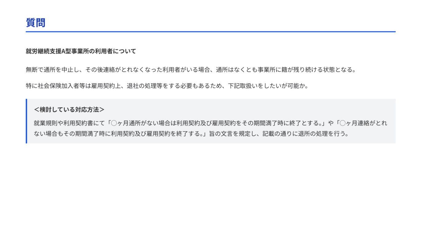 就労継続支援A型事業所において、利用者が無断で通所を中止し、連絡が取れなくなるケースは少なくありません。本記事では、こうした事例に対して事業所がとるべき具体的な対応方法を解説します。社会保険や雇用契約の観点からのリスク、就業規則・契約書での明文化のポイント、実務対応の注意点をわかりやすくまとめています。