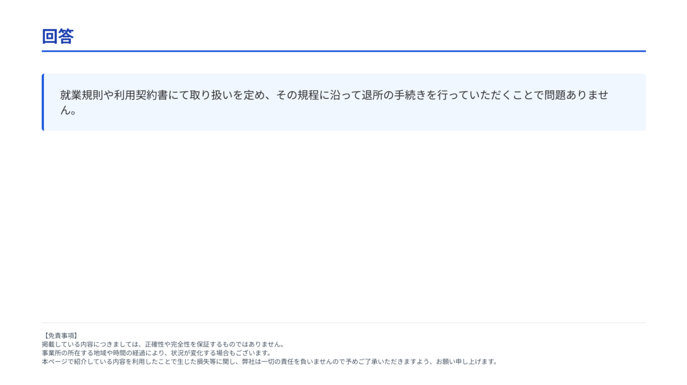 このような規定を設けておけば、問題が発生した際にも契約書や規則に基づいて適切かつ円滑に退所・退職手続きを進めることができます。