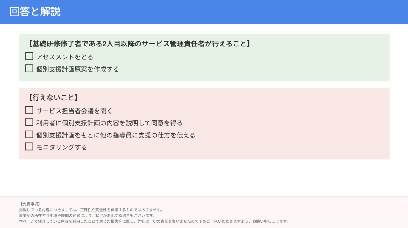 まず、基礎研修修了者である2人目以降のサビ管が行うことができる業務についてです。