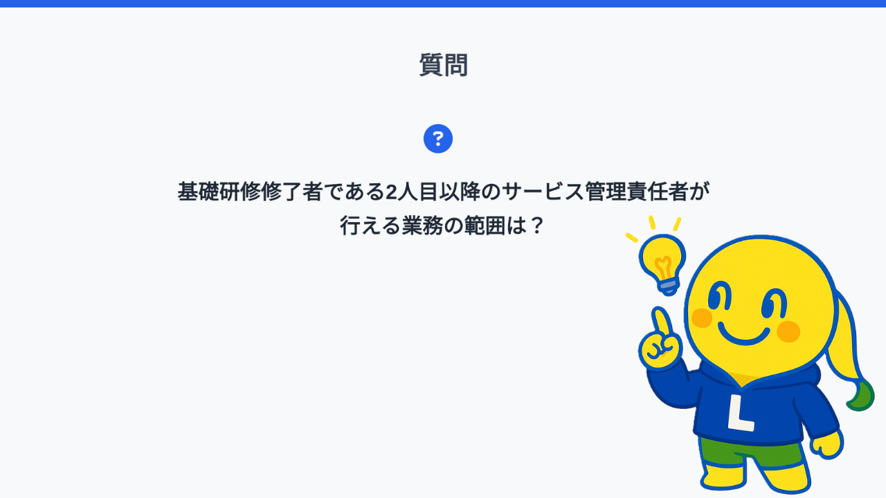 サービス管理責任者の業務は多岐にわたりますが、2人目以降、特に基礎研修修了者の場合は業務範囲に制限があることをしっかり理解しておく必要があります。