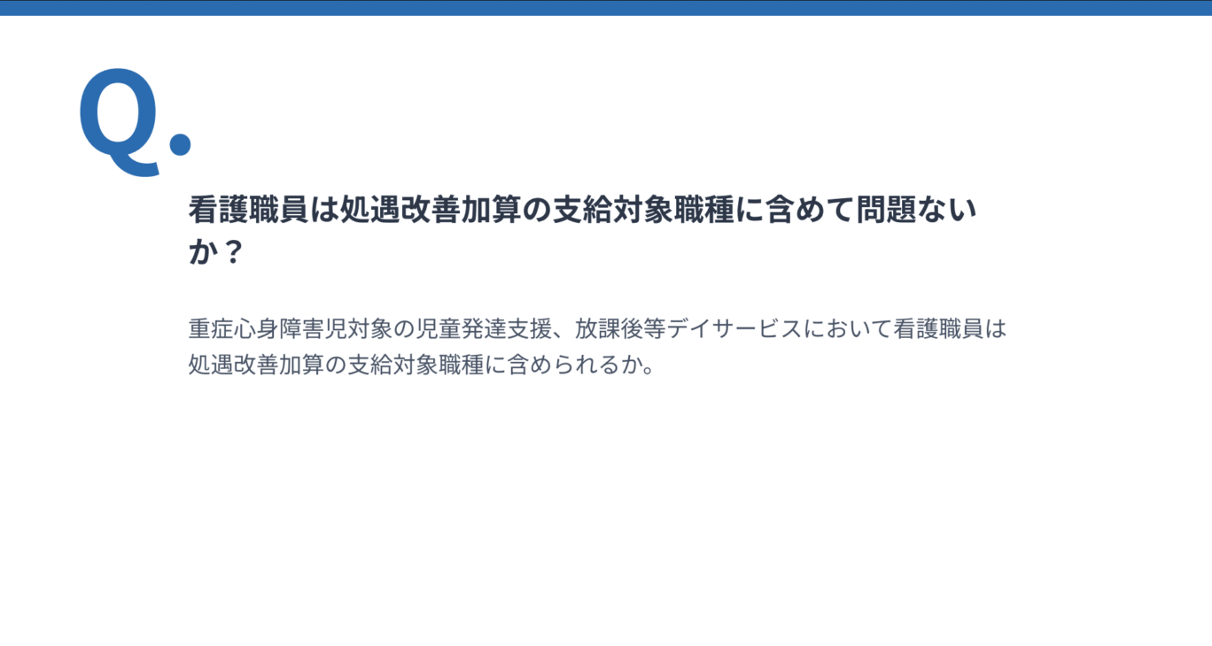 今回は、重症心身障害児を対象とした児童発達支援や放課後等デイサービスにおいて、看護職員が処遇改善加算の支給対象となるかについて解説します。