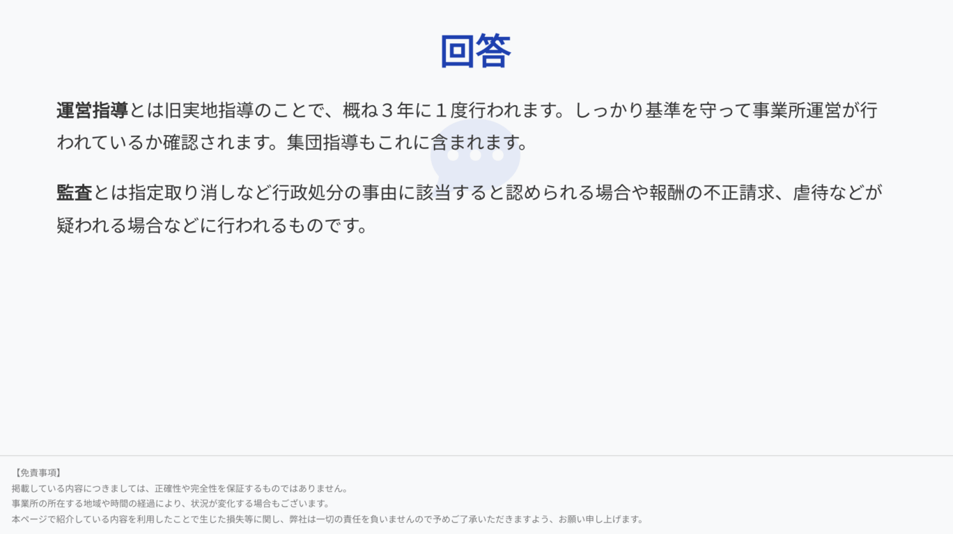 運営指導は事業所の健全な運営をサポートし、質の向上を図ることが目的の制度です。